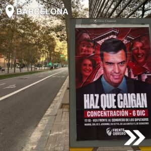El Frente Obrero ha realizado esta semana varias acciones por toda España convocando a una concentración este sábado 6 de diciembre frente al Congreso de los Diputados para denunciar los múltiples escándalos de corrupción que afectan al Gobierno y al entorno de Pedro Sánchez, así como el deterioro político y social que, según la organización, atraviesa el país.