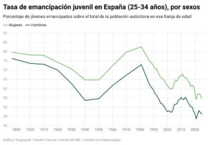 El cambio es especialmente significativo si se observa la evolución histórica. Durante buena parte del siglo XX, lo habitual era que entre el 70% y el 80% de los jóvenes estuvieran emancipados. En la actualidad, esa proporción se ha reducido hasta aproximadamente el 45% en el grupo de edad de 25 a 34 años, lo que evidencia una ruptura clara con el patrón tradicional de acceso a la vivienda.