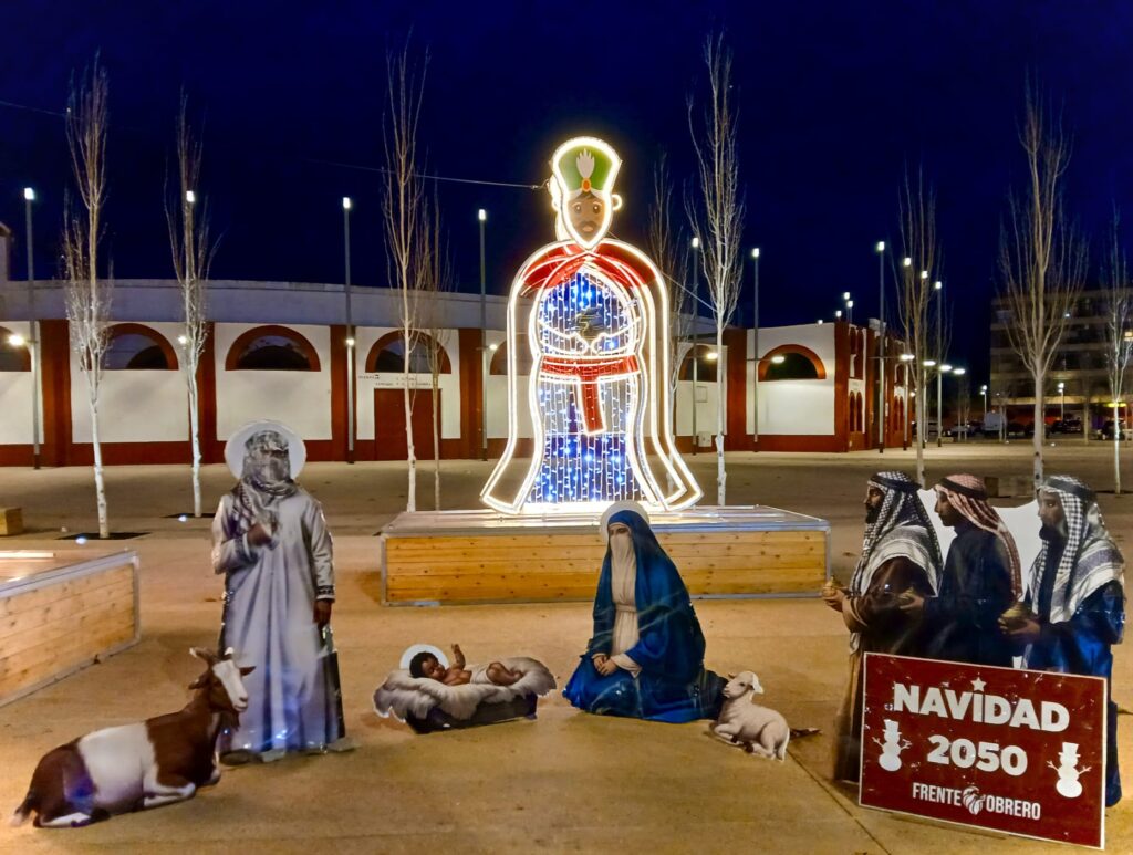 La acción, desarrollada bajo el lema “Navidad 2050”, reinterpreta el belén tradicional incorporando elementos de corte islámico, como una figura de María velada hasta los ojos, una cabra y un cordero en vez de el tradicional buey y la mula, además de otras referencias visuales asociadas a contextos islámicos, como forma de denuncia satírica bajo el lema «Navidad 2050».